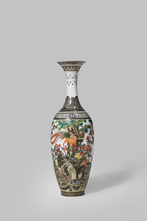 Delicately painted with a pair of phoenix and a multitude of other birds, bai niao chao feng, all amongst flowering peony and rockwork with pine and maple trees, the flared neckrim painted with formal leaves and geometric bands, the base inscribed Jing de zhen yi shu ci chang chu pin, 16cm.