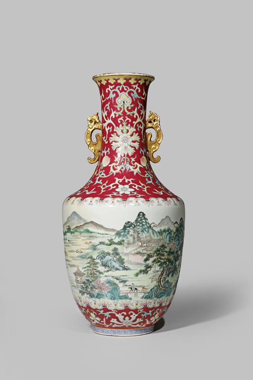 The body painted with a continuous scene of mountains, streams and figures, the neck decorated with stylised lotus flowers, peaches and Buddhist symbols on a ruby ground, the base with a six character Qianlong seal mark, 33.6cm.