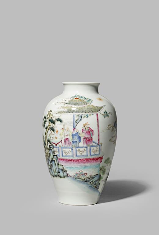 A CHINESE FAMILLE ROSE 'IMMORTALS' VASE REPUBLIC PERIOD Brightly enamelled with the gods in a pagoda