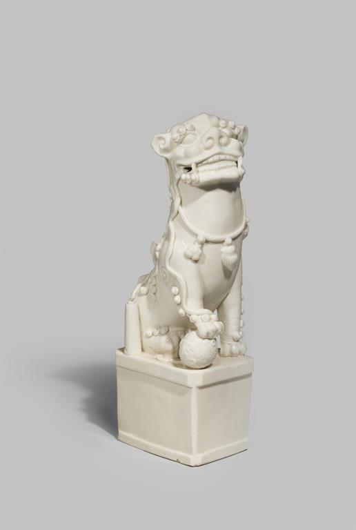 A LARGE CHINESE BLANC DE CHINE BUDDHIST LION DOG C.1700 Sitting with his right forepaw resting on...