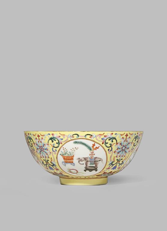 A CHINESE 'MEDALLION ' BOWL PROBABLY LATE QING DYNASTY Brightly enamelled with four roundels...