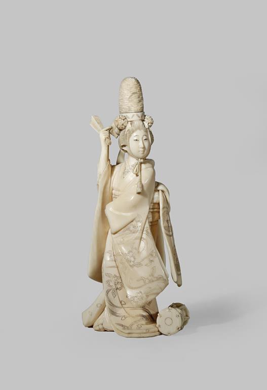 λ A JAPANESE IVORY OKIMONO MEIJI 1868-1912 Carved as a lady with fan and eboshi (Shinto headdress)