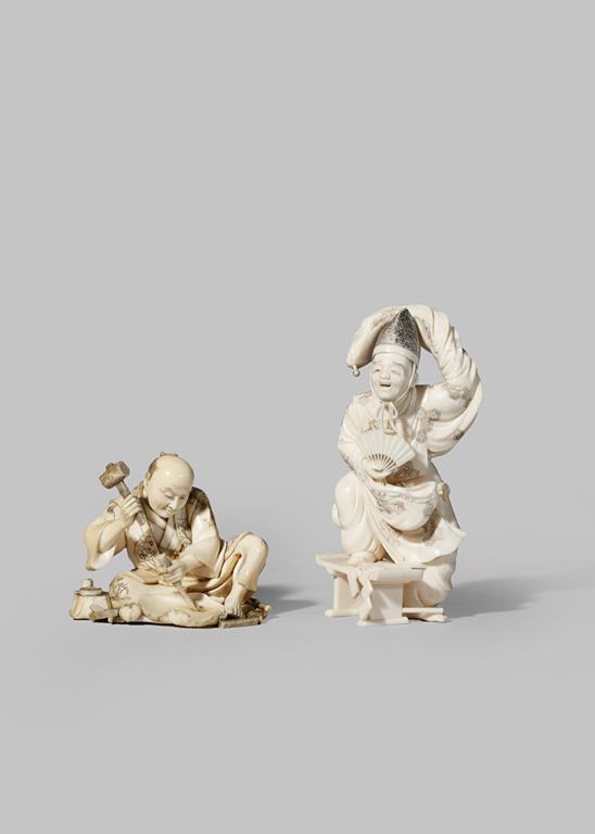 λ TWO SMALL JAPANESE IVORY OKIMONO MEIJI 1868-1912 One depicting a sculptor at work seated on a...