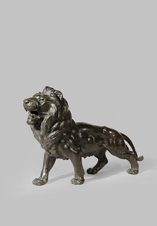 A JAPANESE BRONZE OKIMONO OF A LION MEIJI 1868-1912 Standing four-square with its head raised and...