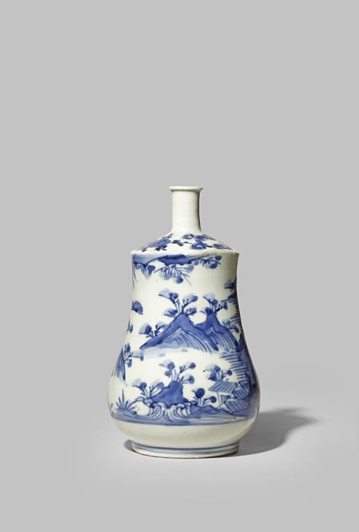 A JAPANESE ARITA BLUE AND WHITE SAKE BOTTLE