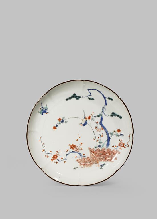 A JAPANESE KAKIEMON PLATE C.1700 The octofoil body decorated with two birds and the Three Friends...