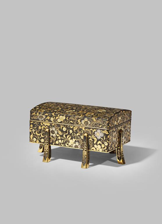 In the shape of a karabitsu (a traditional treasure chest), the body decorated with sakura flowers, buds and scrolling leaves inlaid in silver and gold on a dark ground, raised on six elegantly curved legs, the base inscribed Yoshitoyo saku (made by Yoshitoyo), 12.1cm. (2)
