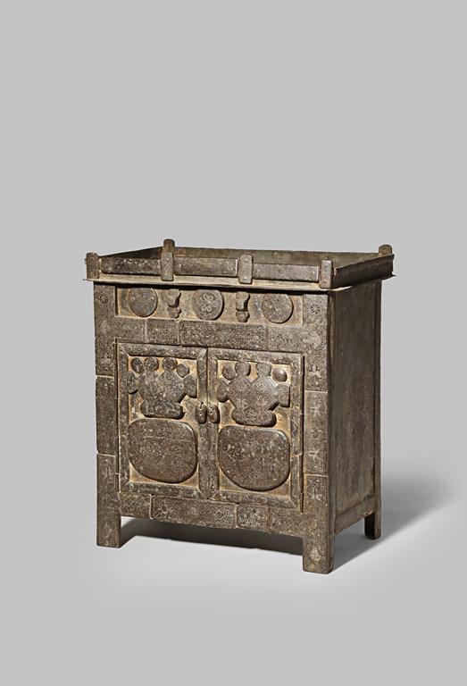 A SMALL KOREAN SILVER-INLAID IRON CABINET 19TH CENTURY The rectangular body with a pair of hinged...