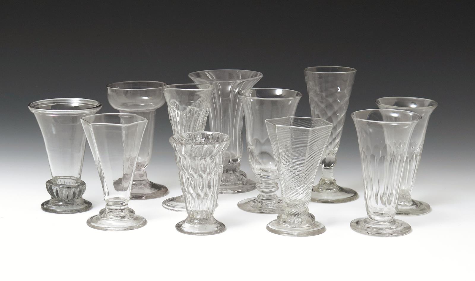 Eleven jelly glasses 18th century, of varying form, with spiral, ribbed and honeycomb moulding, one pan-topped, two of hexagonal form, two cut with vertical flutes, all raised on low circular feet, 13cm max. (11)