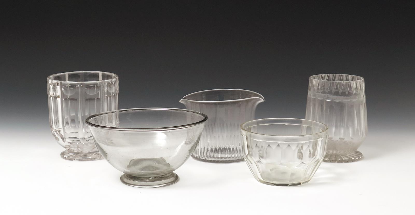 Three glass bowls 18th century and later, one raised on a low circular foot, with everted rim, one cut with two interlocking bands, another of deep U-shape and cut with polished ovals and rectangular panels, a glass cooler cut with a band of vertical flutes, and a tumbler cut with ovals and raised on a starcut foot, 16.5cm max. (5)