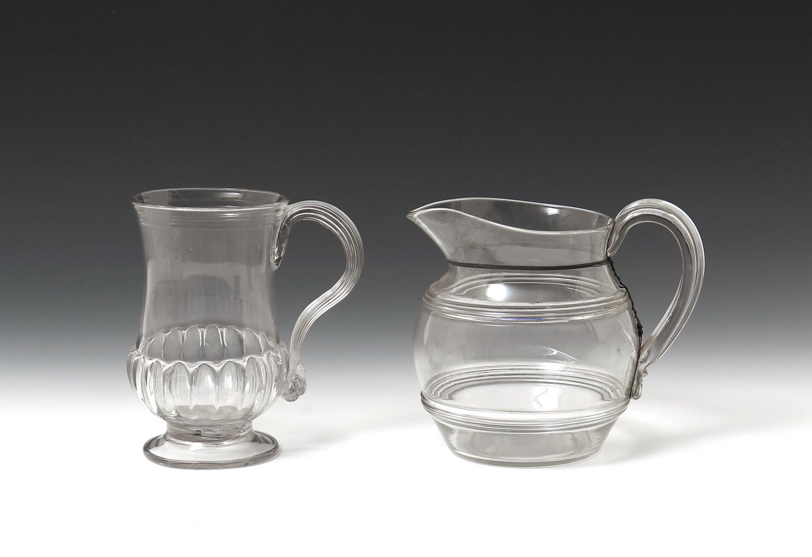 A glass mug 18th century, of bell shape, with gadroon moulding around the base, raised on a circular foot, the rim moulded with narrow concentric bands, a grooved strap handle, and a glass jug applied with two triple bands, the jug cracked, 15cm. (2)