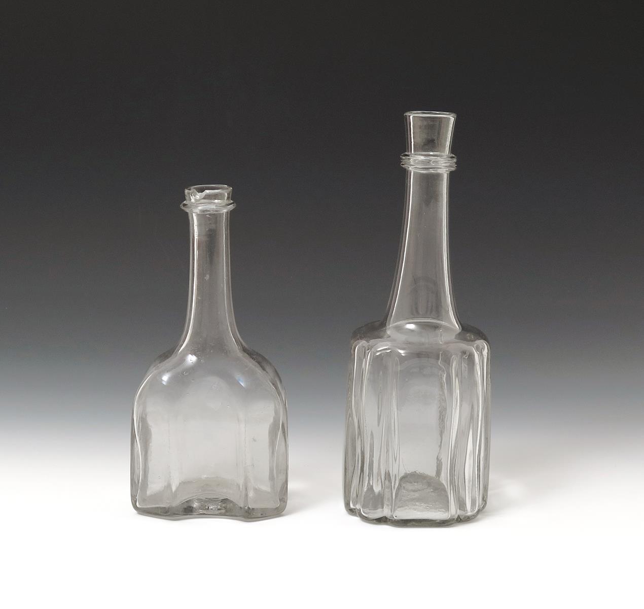 Two glass serving bottles or decanters c.1740, one of octagonal moulded form, the other cruciform, both with long tapering necks applied with string rims, the smaller decanter with a rim chip, 27cm max. (2)