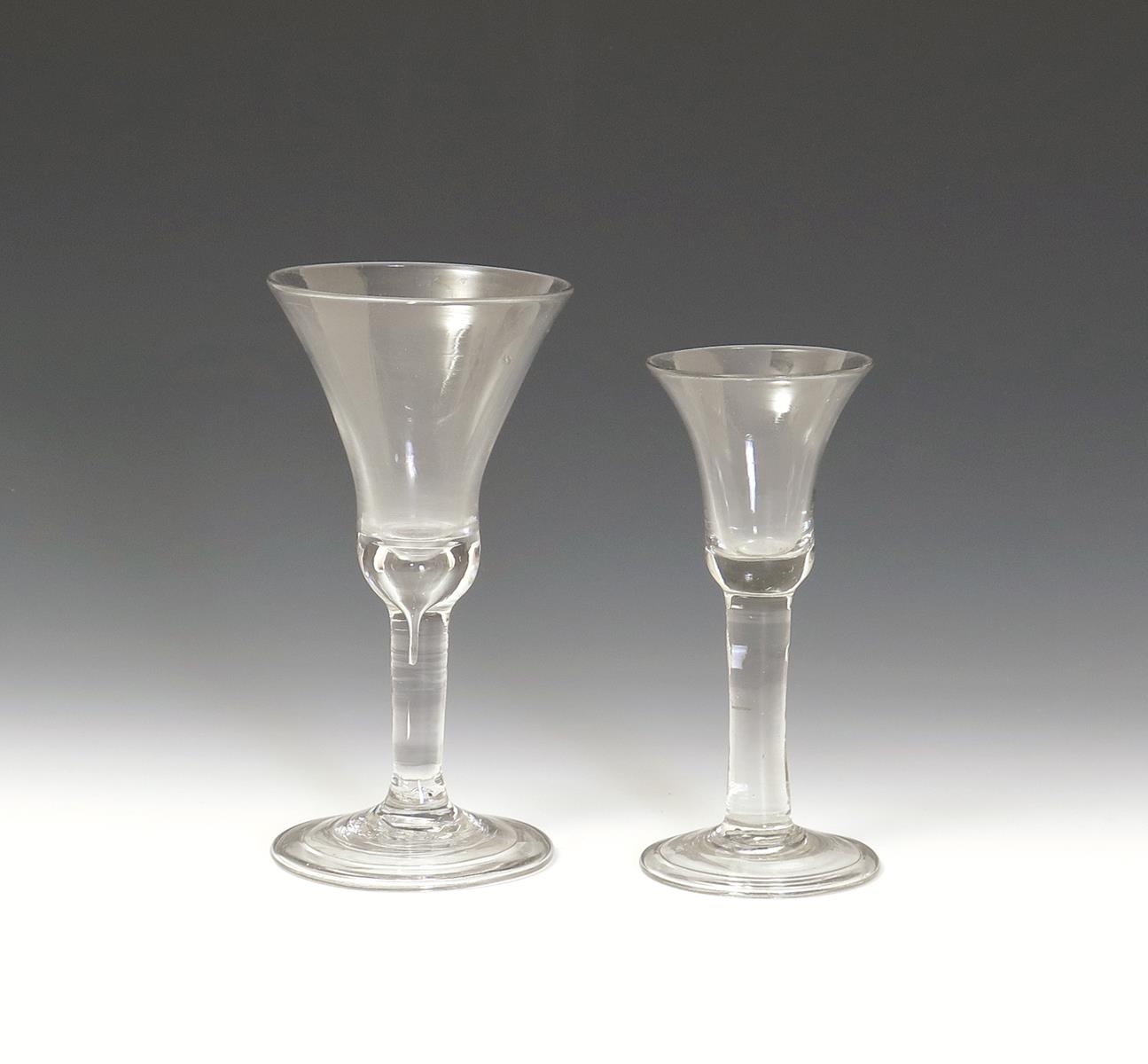 Two large wine glasses mid 18th century, with bell bowls, the smaller raised on a plain stem, the larger with a single air tear, each on a folded conical foot, 18cm max. (2)