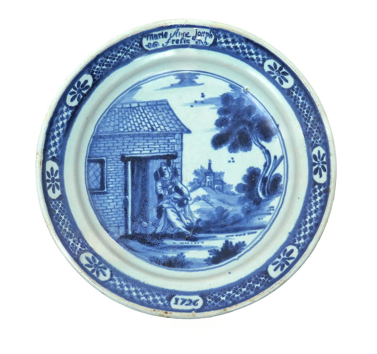 A large Delft dish 18th century, painted in blue with a figure seated in the doorway of a low brick building, a church visible in the distance, the panelled diaper rim enclosing the date '1726' and the name 'Marie Anne Joseph Fresie', some cracks, a filled rim chip, 31.7cm.
