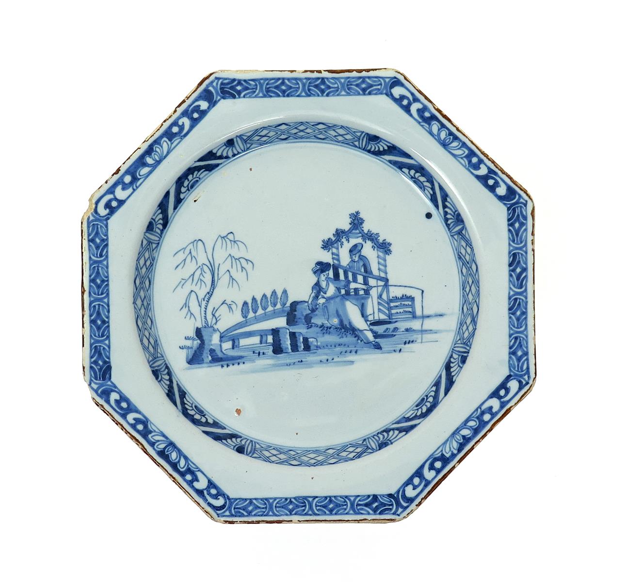An octagonal delftware plate c.1770, Liverpool or Dublin, painted in blue with La PĂȘche, a lady fishing, regarded by a figure beneath an archway, within stylized narrow panelled borders, a chip to the rim, 22.7cm.
