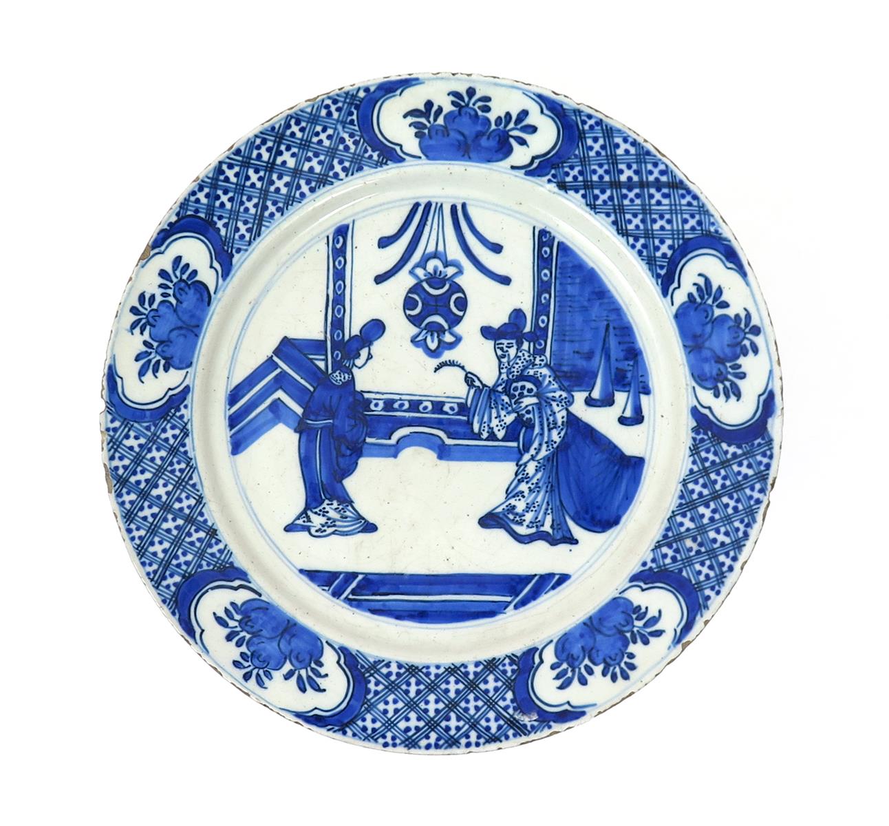 A Delft plate c.1700, painted with a Chinese gentleman and a young maiden in an interior beneath a large lamp, the rim with five floral panels on a hatched diaper ground, cipher mark to the underside, 22.4cm.