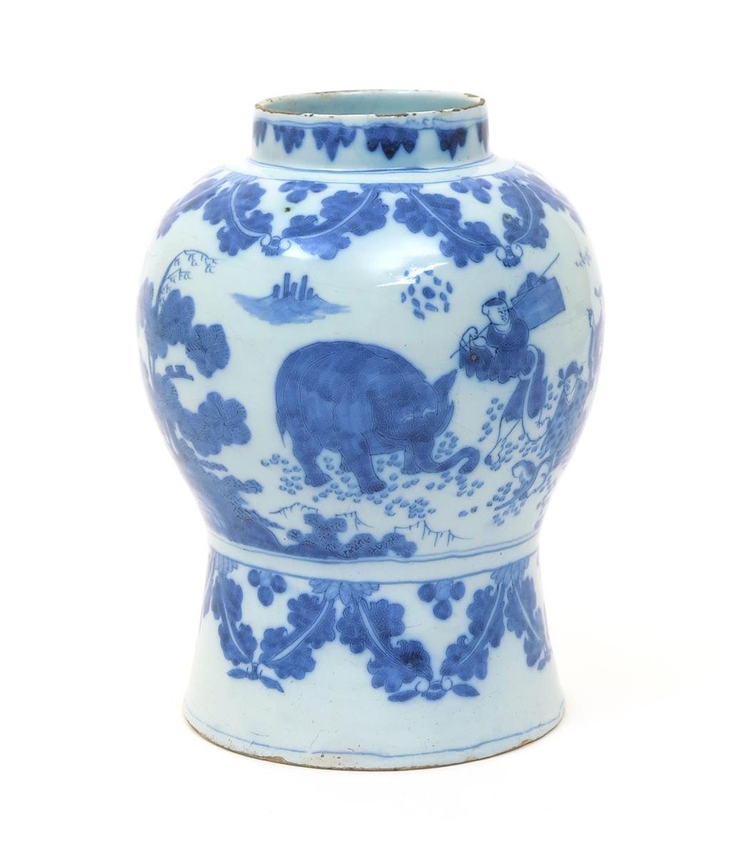 A Frankfurt faïence vase early 18th century, painted in blue in the Chinese manner with three figures beside a large elephant, the reverse with three further figures, the flared foot with a stylized leaf garland, blue circle mark to the base, the cover lacking, 27.5cm.