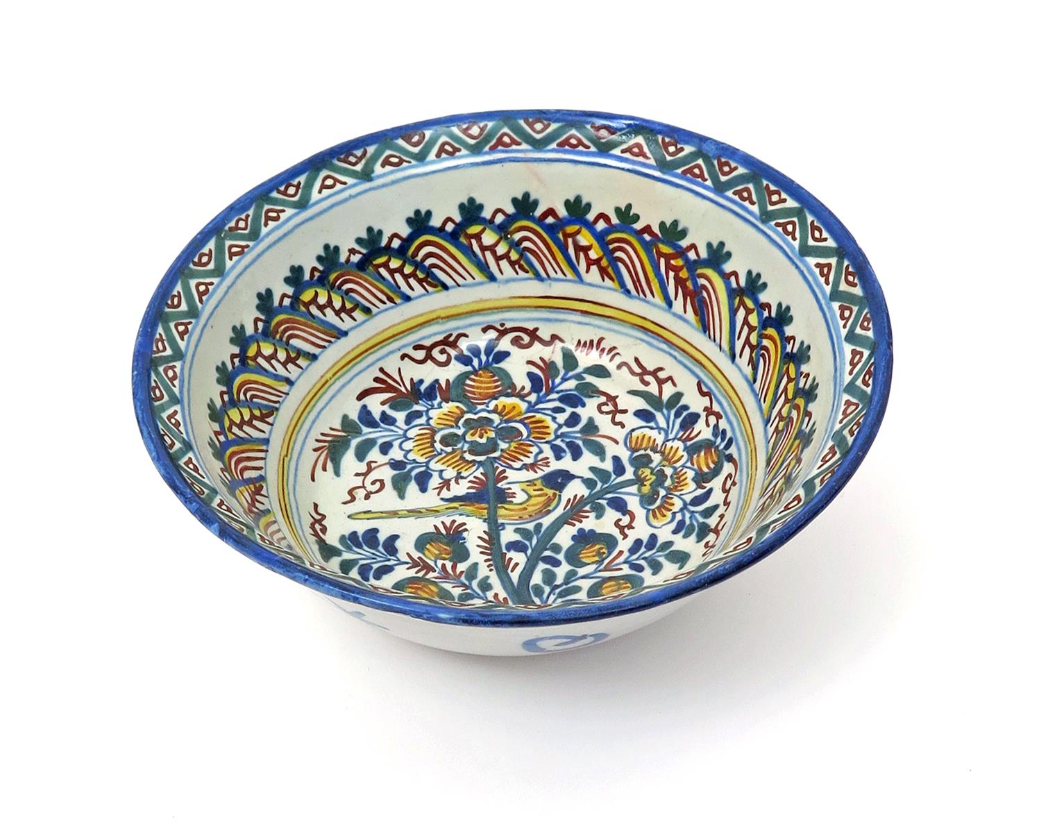 A London delftware bowl c.1705, brightly enamelled to the interior in shades of blue, green, yellow and red, with a bird perched on flowering branches within stylized borders, the exterior with a simple star and circle band, a section broken out and restored, 22.5cm dia.