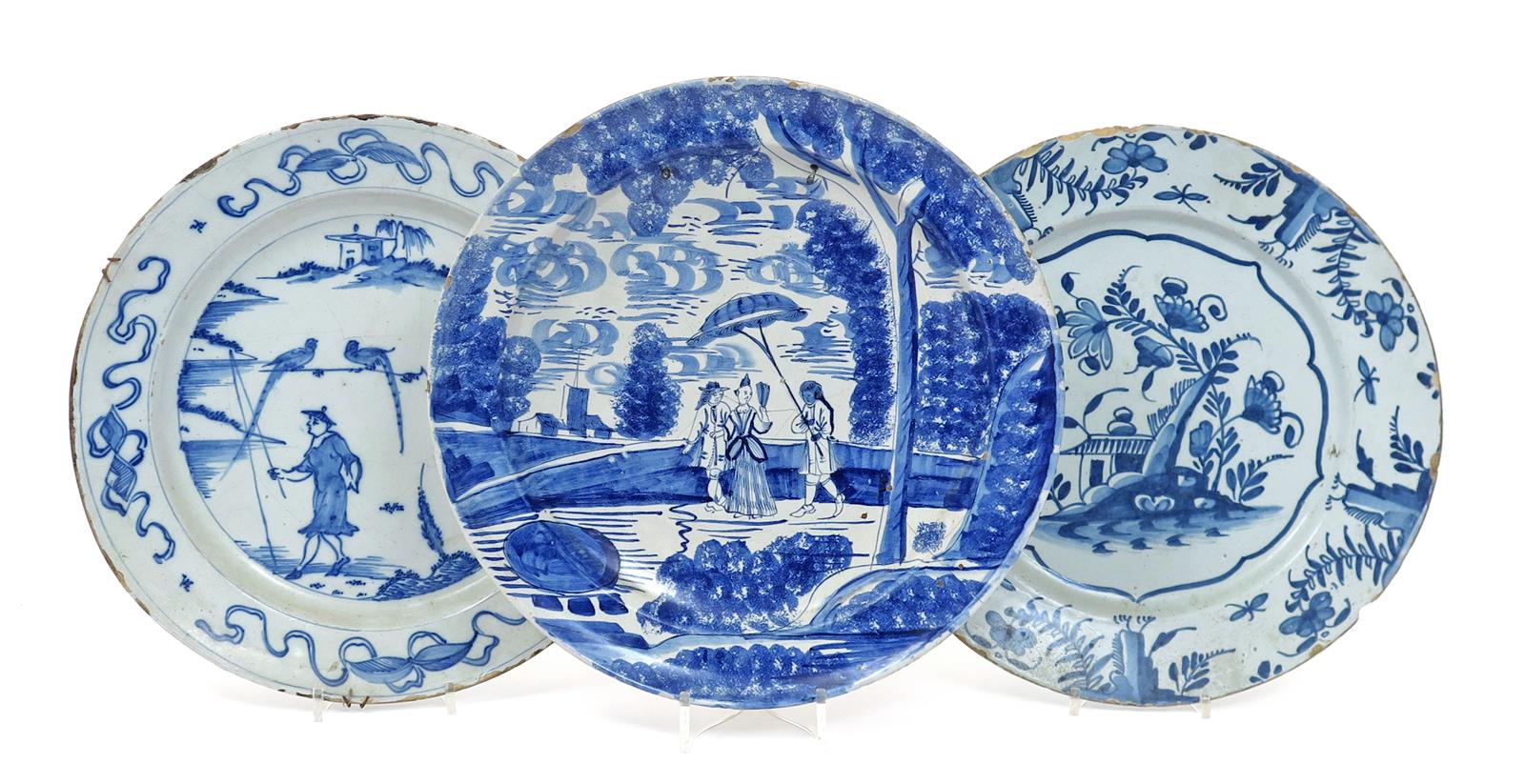 Three large delftware plates or chargers 18th century, all painted in blue, one with a servant holding a parasol over a promenading couple beneath sponged trees, one with a Chinese figure beneath two long-tailed birds perched on a branch, the last with a low hut behind rockwork and flowering Oriental branches, some damages, 34.5cm max. (3)