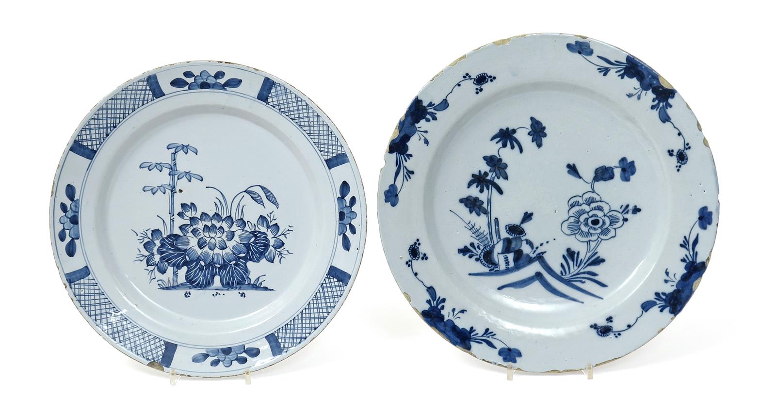 Two large delftware plates c.1760, one probably Bristol, painted in blue with differing designs of bamboo, peony and chrysanthemum, some glaze chipping, 31.3cm max. (2)
