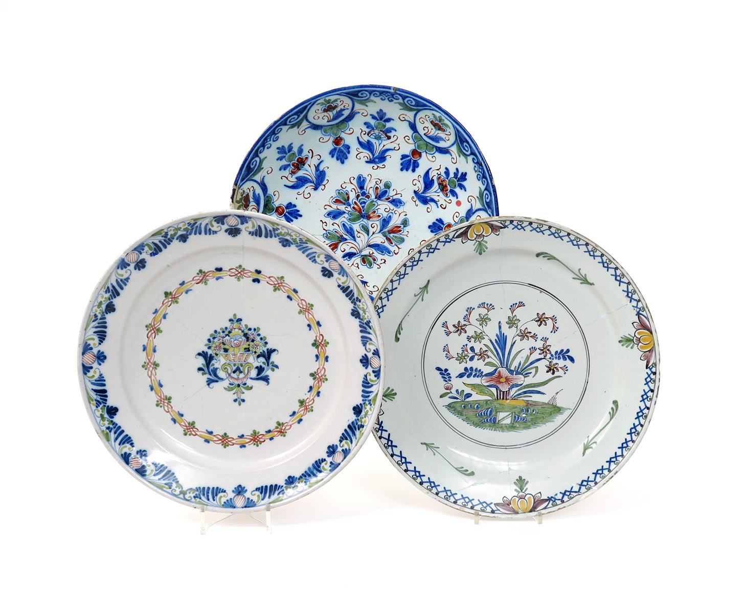 Three large English delftware dishes or chargers c.1720-30, variously decorated in polychrome enamels with stylized flower sprays, a small basket vignette and a landscape panel, damages and restoration, 36cm max. (3)