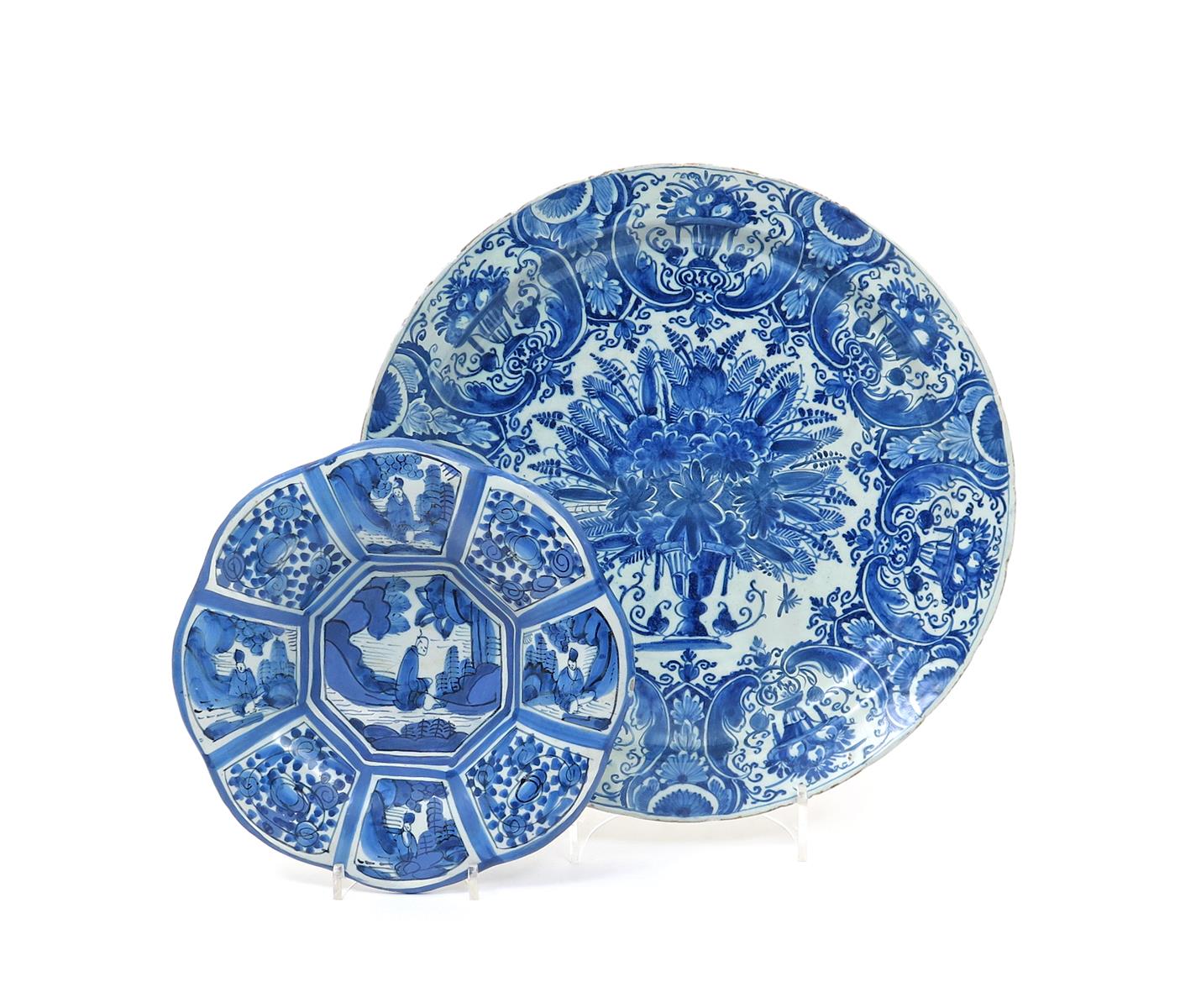 Two Delft dishes c.1690 and later, one of lobed form and painted with a seated Chinaman in a garden setting, with similar panels to the rim, the other painted with a large vase of flowers and feathers, with panels containing urns of fruit to the rim, restoration to both, 39.5cm max. (2)