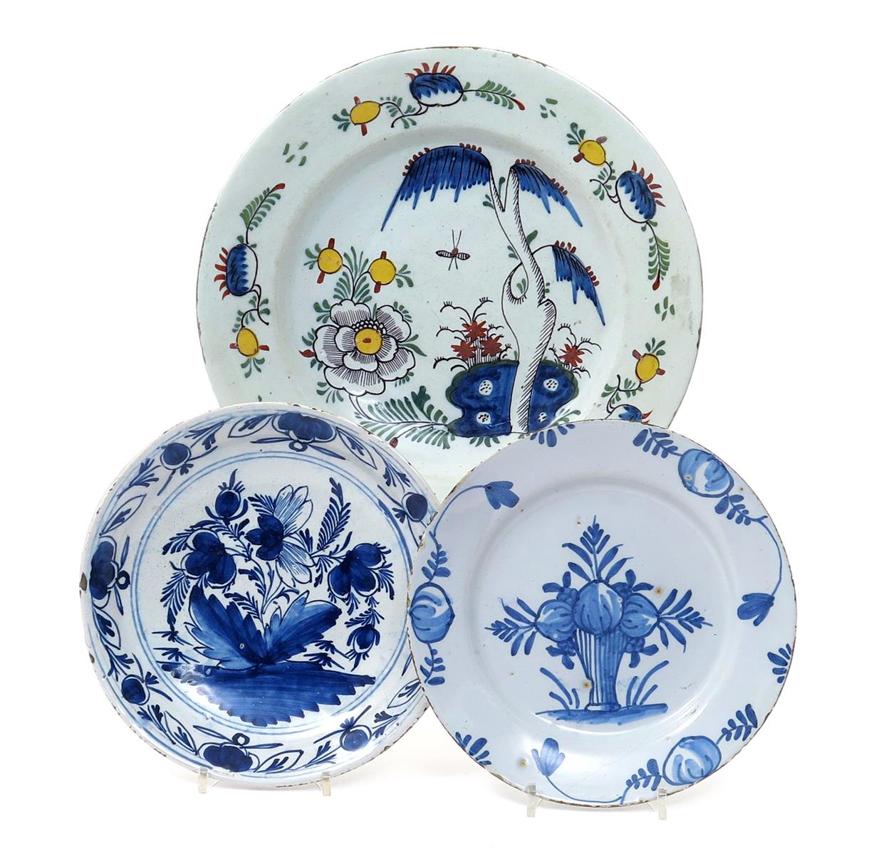 Three Delft plates 18th century, the largest polychrome and painted with a peony spray beneath weeping willow, the smaller two in blue with floral arrangements, some faults and restoration, 31.7cm max. (3)