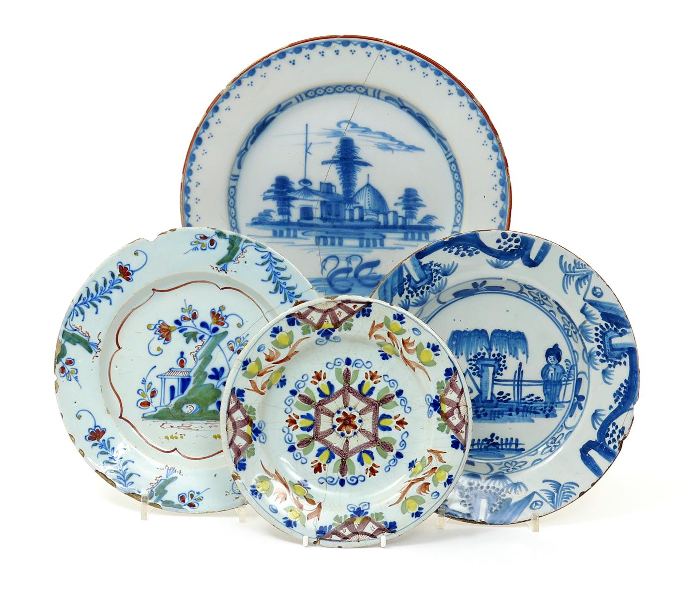Four delftware plates 18th century, the largest painted in blue with two swans before buildings, one with a Chinese figure standing before a fence, one in polychrome enamels with a hut behind tall rockwork, the smallest of Ann Gomm type with a hexagonal motif within stylized flowers, some damages, 27cm max. (4)