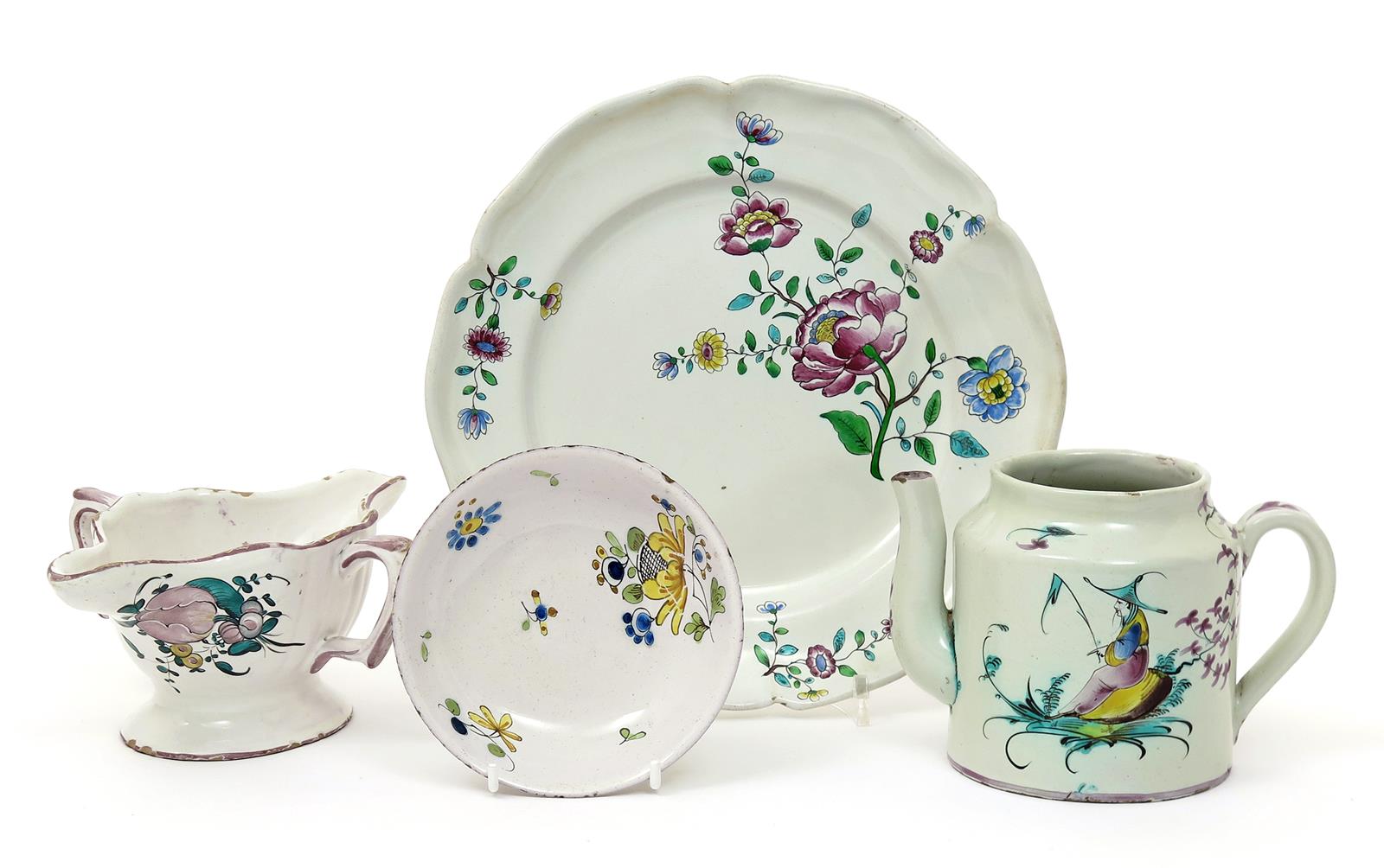 Four items of French faïence 2nd half 18th century, including a Toulouse cylindrical teapot painted with a strutting bird to one side and a fishing Chinaman to the reverse, a two-handled sauceboat painted with flowers, a shaped Paul Hannong plate painted with a large peony spray, and a deep saucer with stylized flower sprays, some damages, the teapot's cover lacking, 24.8cm max. (4)