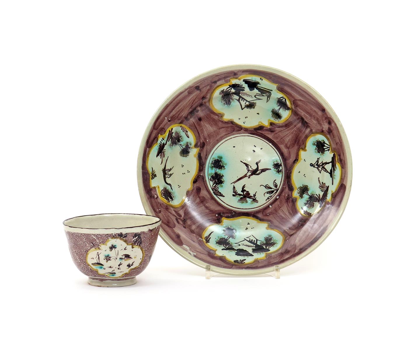 A Savona faïence plate and a sugar bowl c.1770-80, each painted with panels of figures, birds in flight and buildings in landscapes, reserved within ochre borders on a manganese ground, some restoration, 23.5cm max. (2)