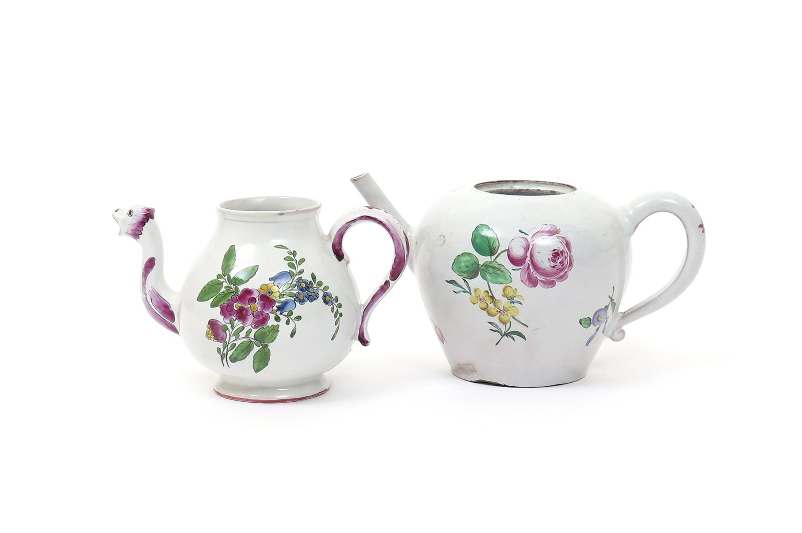 Two French faïence teapots c.1760-70, one Niderviller or Strasbourg, the pear-shaped body boldly painted with flower sprays, the spout formed as a mythical beast with puce scroll highlights, the other probably Bayreuth with a narrow straight spout and heavy handle with scroll terminal, simply painted with flowers, the covers lacking, 19cm max. (2)