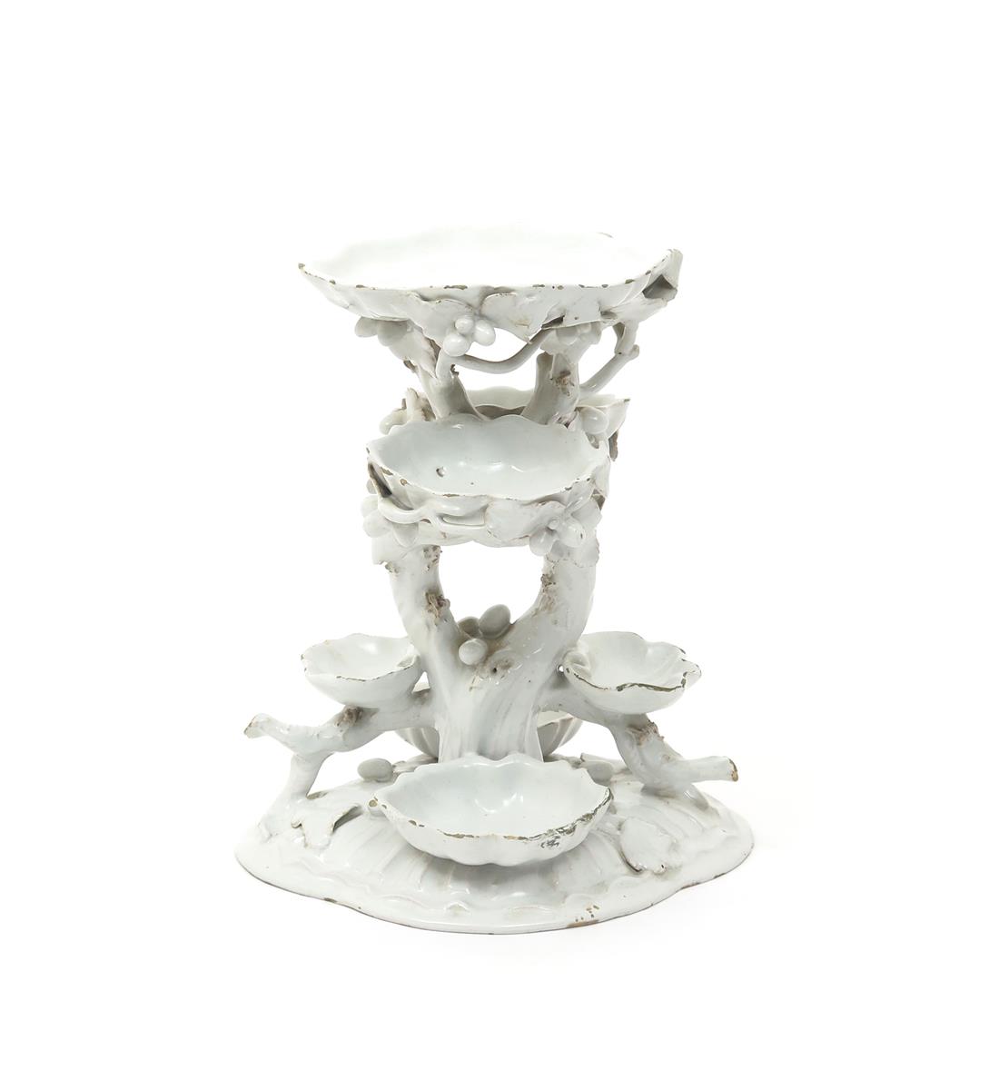 A large tin-glazed sweetmeat stand 2nd half 18th century, possibly Ludwigsburg, formed of three tiers of two shells beneath a central scalloped platform, supported on a gnarled branch issuing nuts and leaves, raised on a fluted quatrefoil base, a little glaze chipping, 26.5cm.
