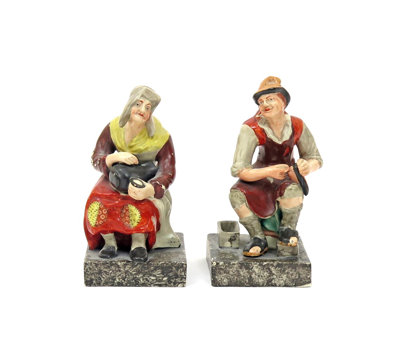 A pair of Staffordshire pearlware figures of the Cobbler and his wife c.1820, both seated, she with a jug and cup, he working on a shoe while his toes peep through his own, each on a square black base, minor faults, 16cm. (2)