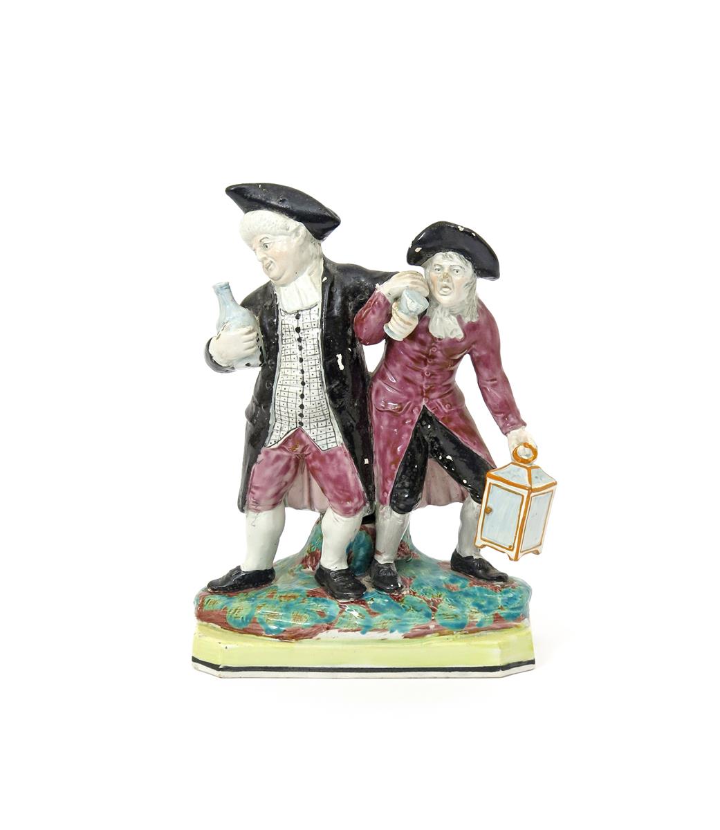 A Staffordshire pearlware group of the Vicar and Moses c.1820, after Wood, the drunken pair holding onto each other and variously clutching a bottle, a goblet and a large lantern, raised on a rectangular yellow base with chamfered corners, a few small chips, 24cm.