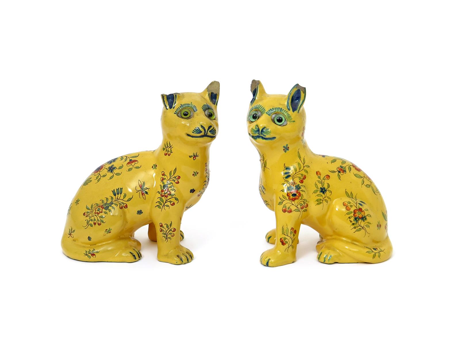 A pair of Gallé-style faïence models of cats late 19th century, each seated on its haunches, painted with sprays of red and blue flowers on a rich yellow glaze, set with glass eyes, black FF monogram to one, some damages to the ears, 21cm. (2)
