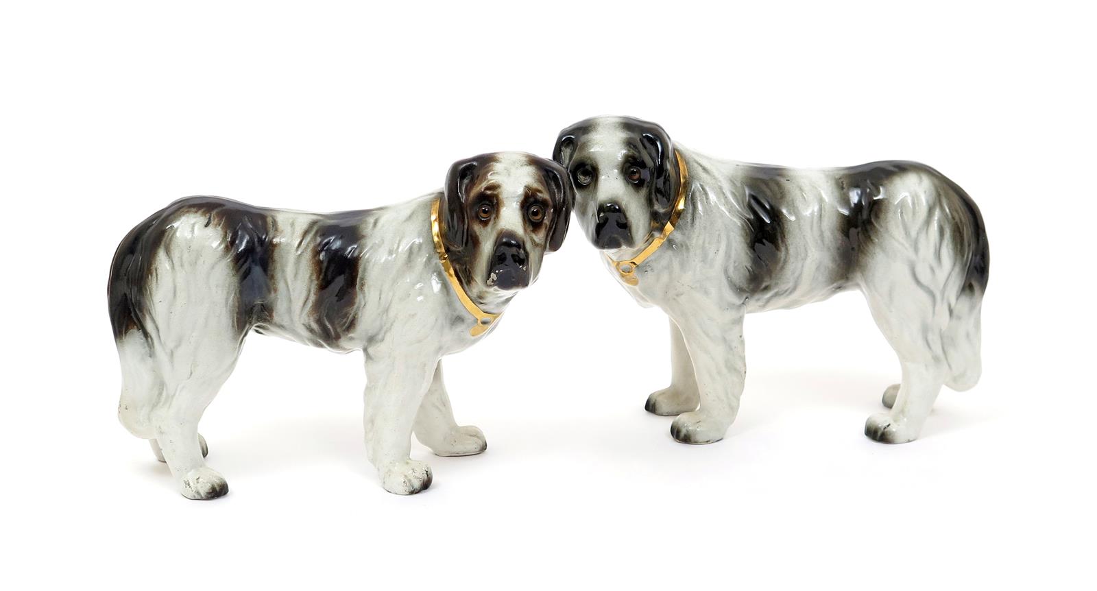 A pair of Scottish pottery models of dogs 19th century, Bo'ness Pottery (Borrowstounness) each modelled as a St Bernard, standing with heads turned and wearing gilded collars, set with glass eyes, one eye lacking, 32.5cm long. (2)