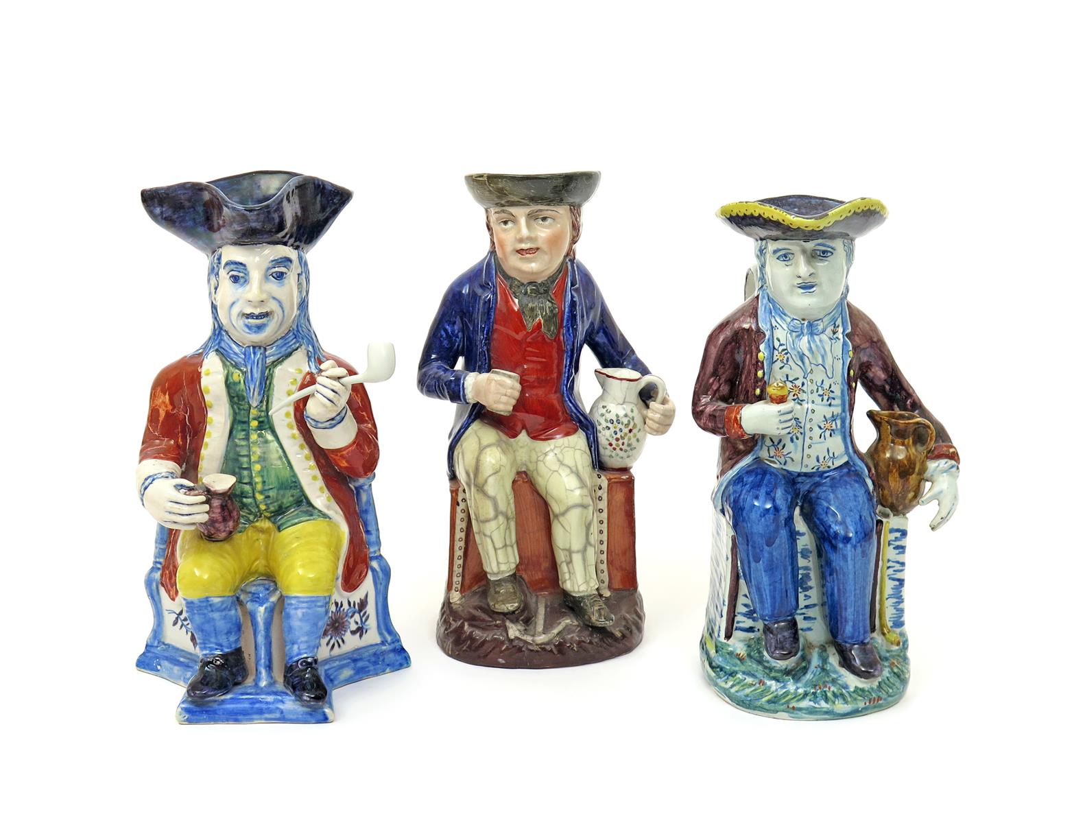 Two Delft Toby jugs 19th century, one of Squire type with a long pipe and seated on a shaped base, the other a Sailor and seated on a sea chest, red marks after Adriaenus Koeks, and a pearlware Sailor Toby jug wearing a blue coat over a red waistcoat and holding a patterned jug of ale, some faults, 30.5cm max. (3)