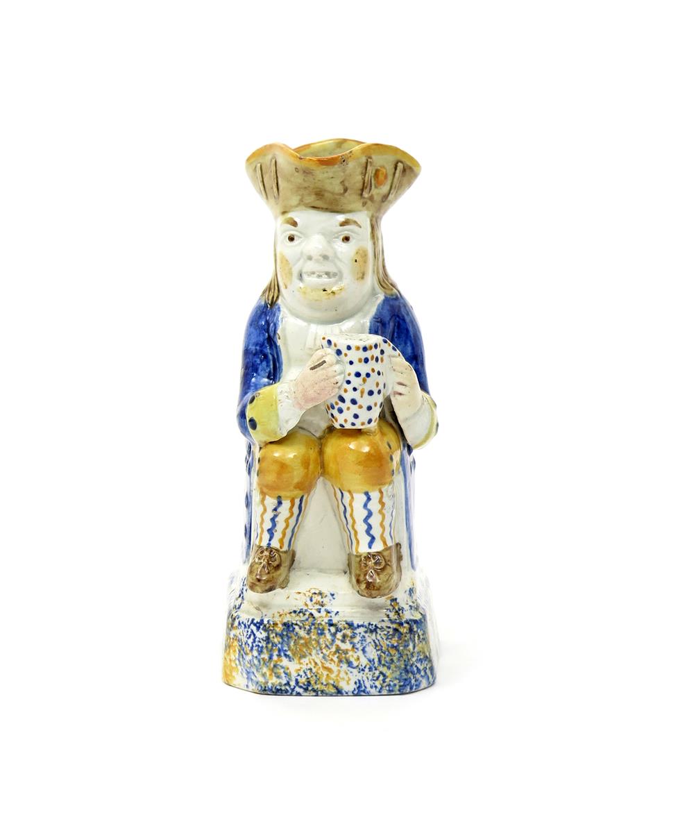 A small Pratt ware Toby jug c.1800, wearing a blue coat over yellow breeches, a spotted jug of ale on one knee, raised on a tall sponged base, a small chip to his hat, 19cm.