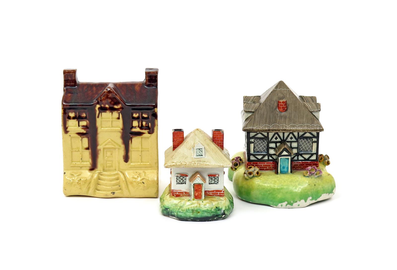 Two Staffordshire pearlware pastille burners 19th century, modelled as square cottages with thatched roofs, and a pottery moneybox modelled as a town house, some damages, 13cm max. (4)
