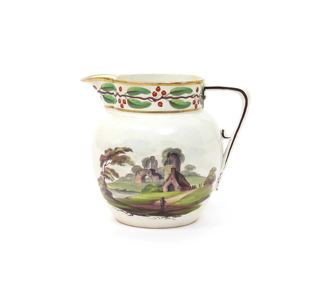 An English pearlware jug of 'Torksey' type early 19th century, painted in the manner of William Billingsley with landscape decoration including a ruined castle by water, the rim with a continuous berried garland between gilt bands, star crack to the base, 16cm high.