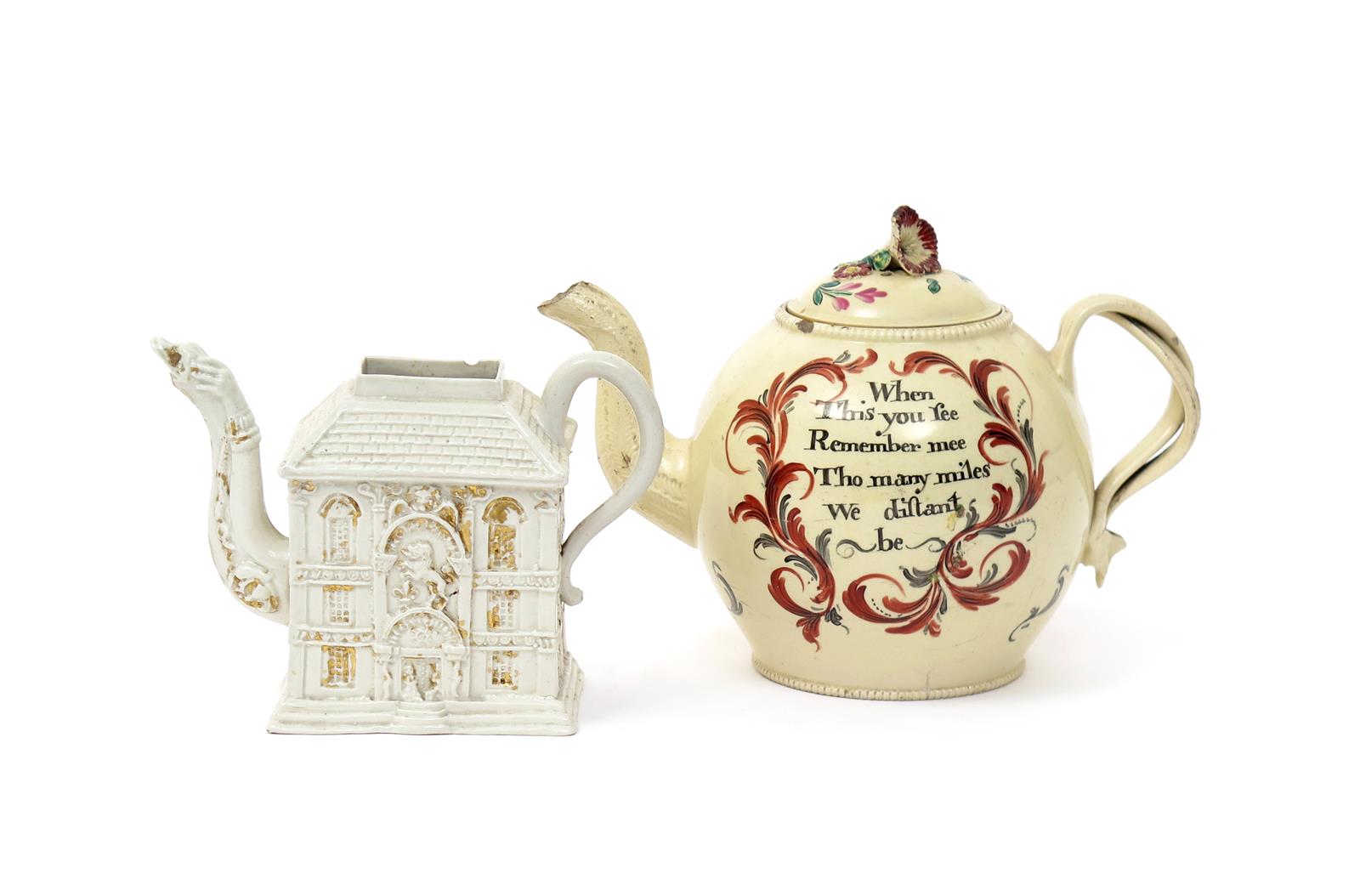 A creamware teapot and cover c.1770, the globular body inscribed 'Bohea Tea' to one side, the other with 'When this you see, remember mee, Tho many miles We distant be', and a salt-glazed stoneware teapot modelled as a three storey building, one side bearing the Royal coat of arms, with gilt detailing, some damages, the cover lacking to one, 19.5cm. (3)