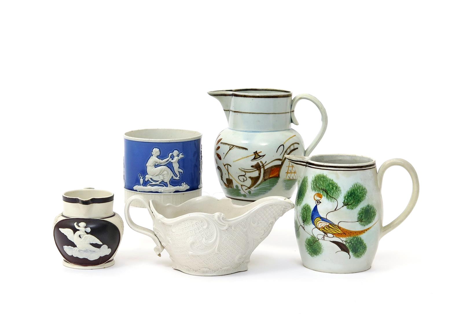 Two Pratt ware jugs c.1800, one painted with farming implements, the other with a Peafowl amidst sponged foliage, a small Herculaneum dry-bodied stoneware jug applied with a putto on the back of an eagle, a stoneware mug applied with Classical figures, and a salt-glazed stoneware sauceboat, moulded with scrolls over a hatched diaper ground, some damages and repairs, 17cm max. (5)