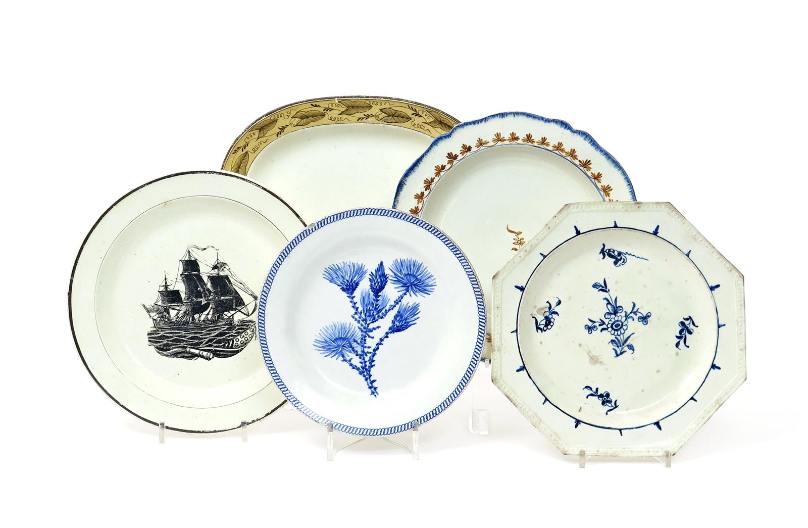 Five creamware plates late 18th/19th century, one oval Spode dish with a convolvulus leaf border, one Wedgwood and printed in blue with a botanical flower spray, one printed in black with a three-masted ship at sail, flying the American flag, one octagonal and painted with naive blue flowers, the last with a feathered rim and painted with a continuous ochre flower border, some faults, 27.5cm max. (5)