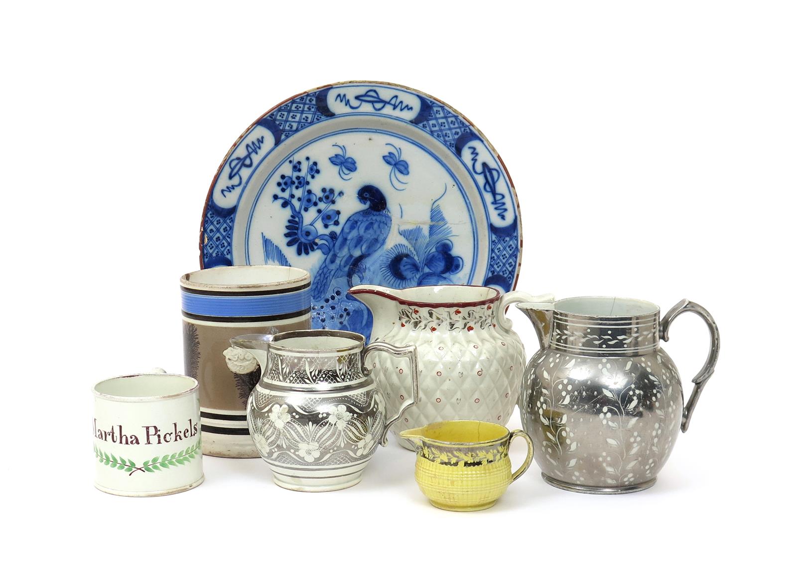 Four pearlware jugs with lustre decoration early 19th century, two decorated in silver lustre with white floral designs, one pineapple moulded and decorated in dots of red and silver lustre, the last yellow-glazed with a silver band, a pearlware quart mug with seaweed frond decoration, a small mug inscribed 'Martha Pickels', and a large Delft dish painted in blue with a parrot perched on a branch, some damages and restoration, 30.5cm max. (7)