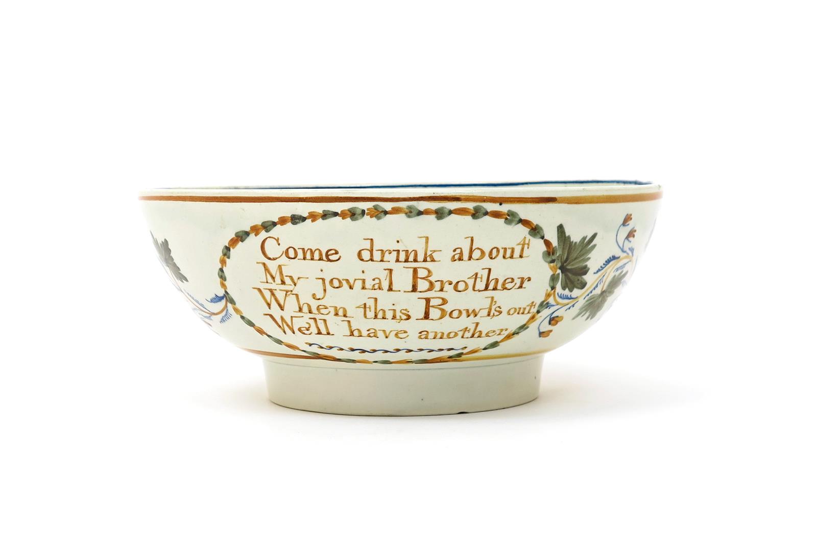 A Pratt ware punch bowl c.1800, the exterior inscribed 'Come drink about My jovial Brother, When this Bowl's out We'll have another', within a leaf cartouche joined by a continuous floral garland, the interior with willow above a low building, 26.2cm dia.