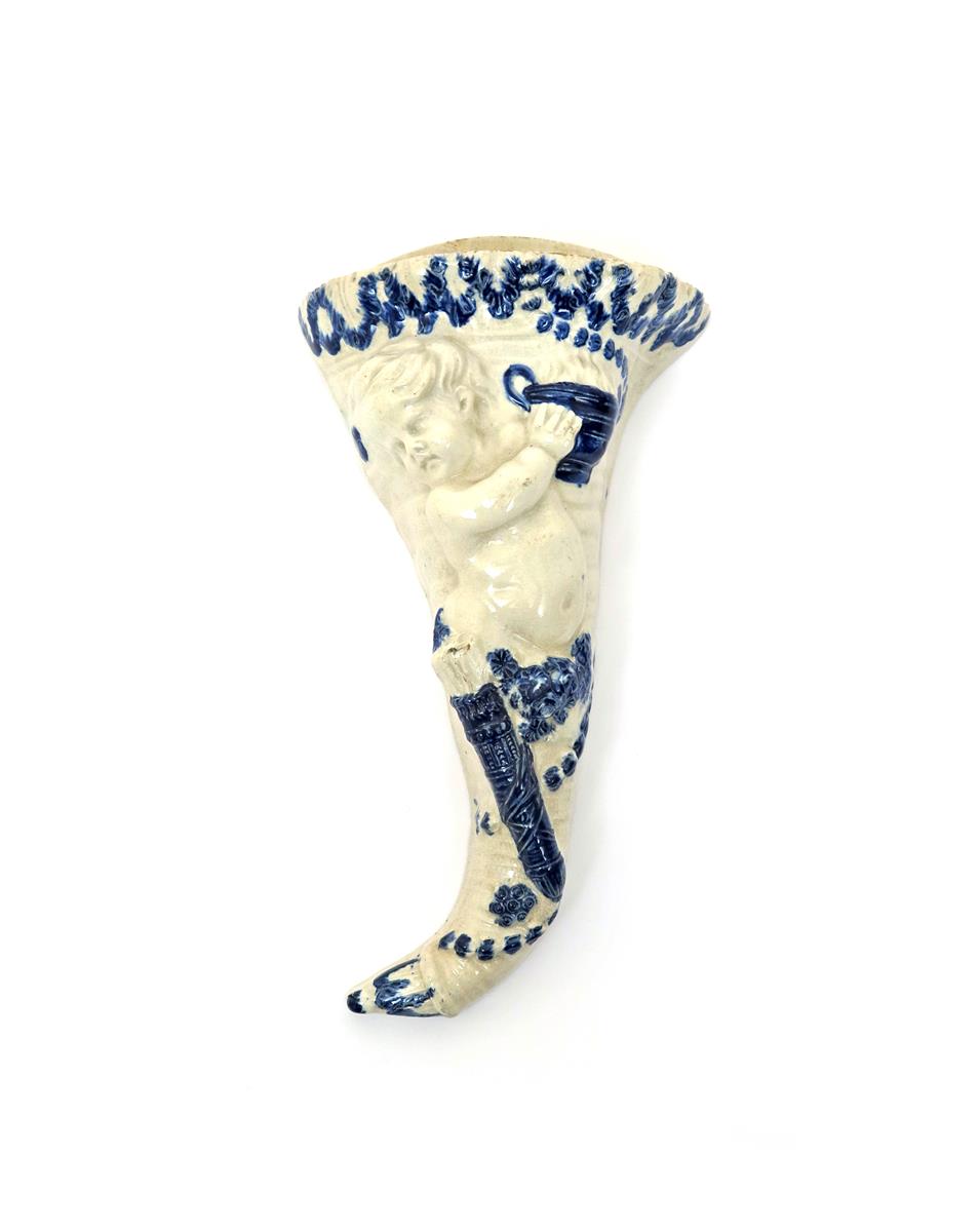 A pearlware wall pocket c.1790, emblematic of Winter, the cornucopia form moulded with a putto holding a brazier of flaming coals, a quiver of arrows by his side, the details picked out in blue, 24.5cm.