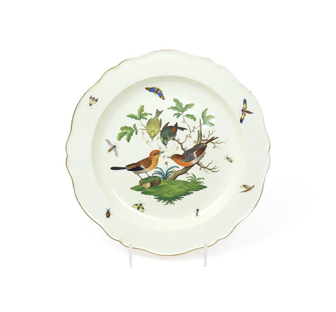 A Wedgwood creamware charger c.1820, boldly painted in the Meissen style with colourful songbirds perched on a low branch, surrounded by scattered insects, impressed mark, 36.2cm.
