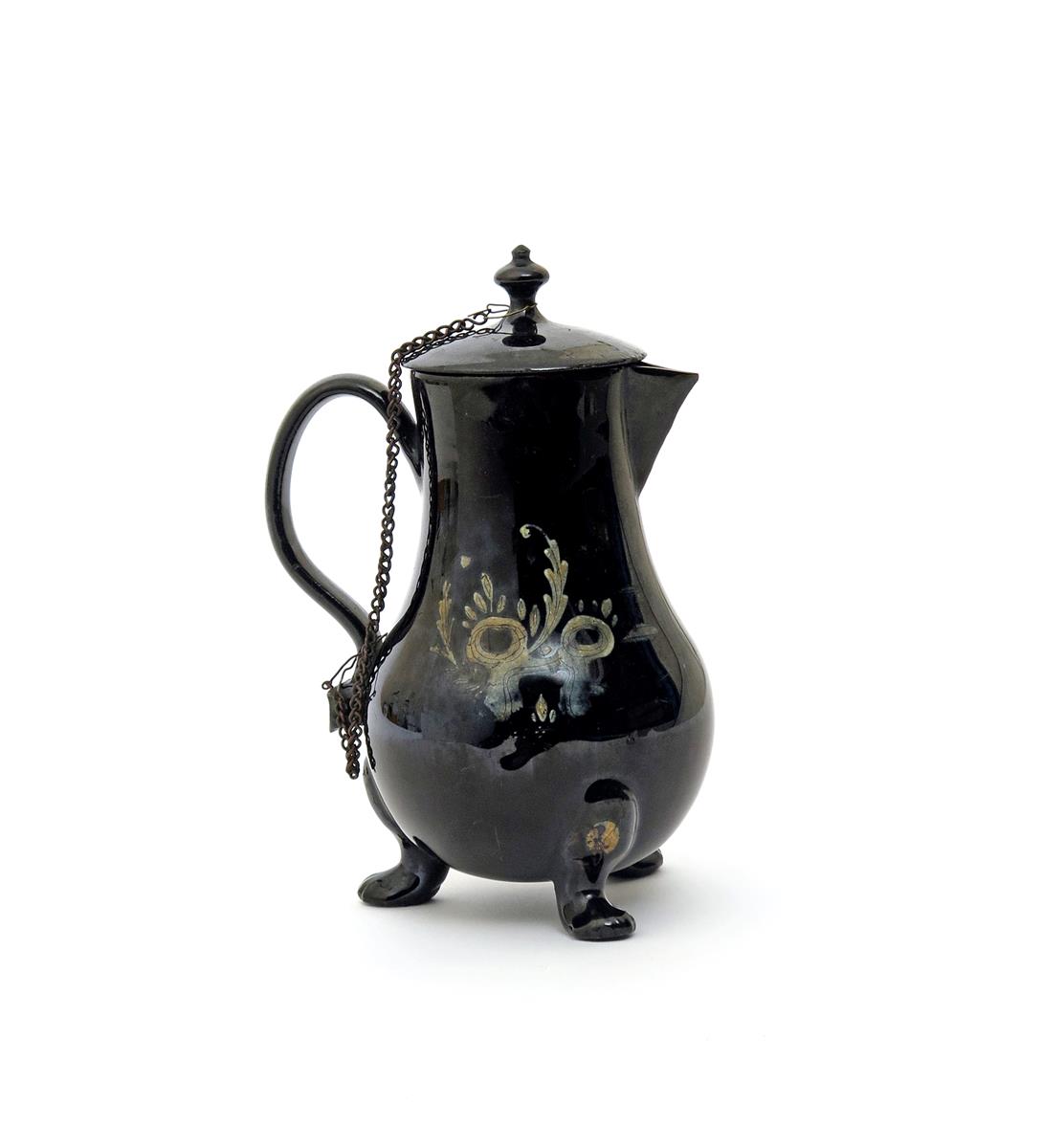 A Jackfield jug and cover 2nd half 18th century, raised on three paw feet, cold-painted with a bird in flight beside flowers, the reverse with holey rockwork, 18.5cm. (2)