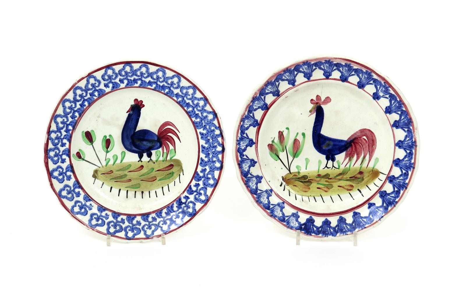 Two Llanelly pottery plates early 20th century, boldly painted with a standing cockerel beside flowers within a sponged blue border, 25cm. (2)