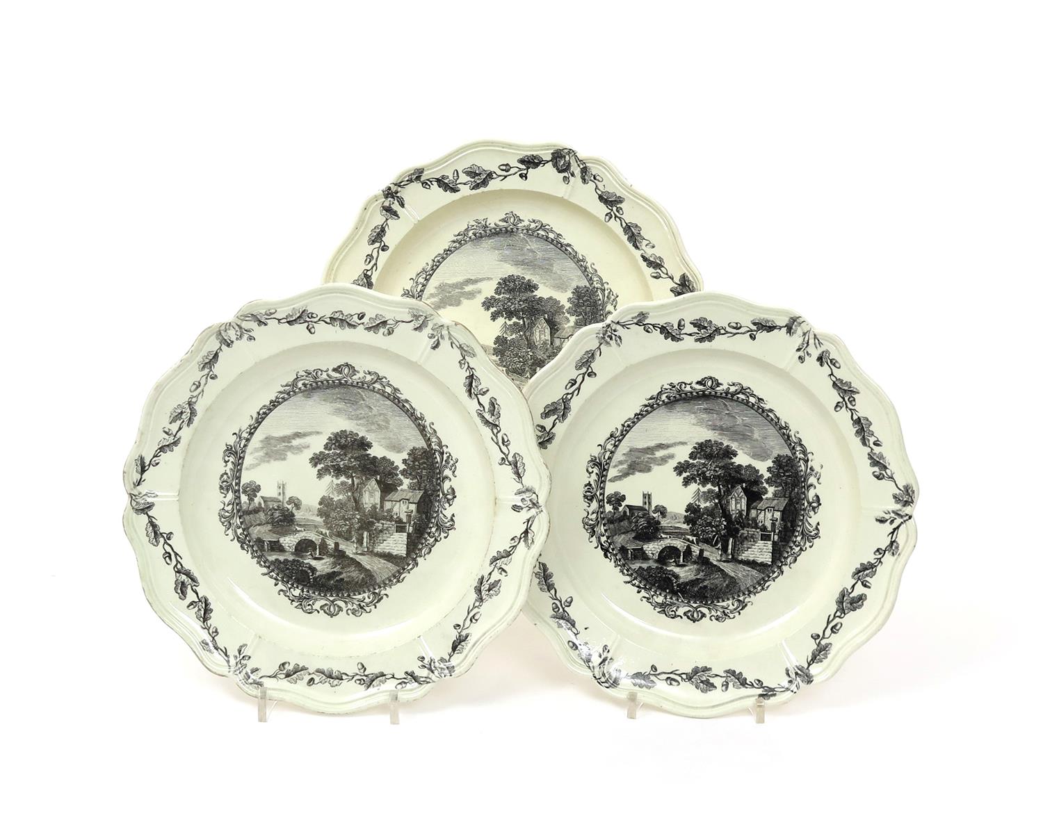 Three Wedgwood creamware plates c.1790, each printed in black with a figure driving cattle across a bridge towards a church in the distance, within a leaf scroll border, the rim with oak leaf garlands, impressed marks, 24.7cm. (3)